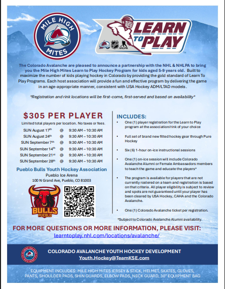 Mile High Mites Learn to Play Hockey Program for kids aged 4-9 years old.